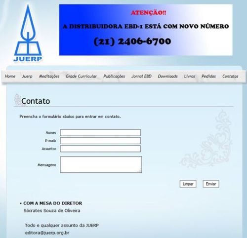 Além disso, no site da JUERP, encontramos uma última atualização, na página reservada para contatos, e observamos que o nome do Pr. Sócrates Souza de Oliveira figura como diretor da organização, conforme imagem abaixo extraída do site da JUERP à página http://www.juerp.org.br/contato.php?id_conteudo=3. (online em 21/04/2014)